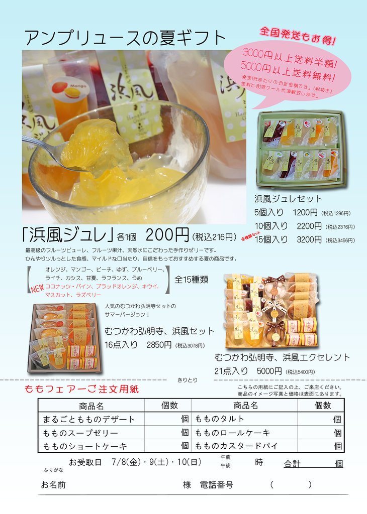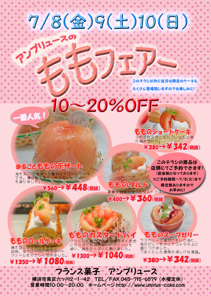桃フェアのお知らせ! 2016.07.4 Infomation Tweet 7/8(金)~10(日)の3日間限定の割引セールです。 11(月)以降は通常価格にて販売いたします。 (画像をクリックすると大きくなります) パンフレットに載っていない当日限定の桃ケーキもございますのでお楽しみに! ご予約は店頭でおこなっております。 7/5(火)までとなっております。 Facebook で共有するにはクリックしてください (新しいウィンドウで開きます) Facebook クリックして X で共有 (新しいウィンドウで開きます) X Tweet