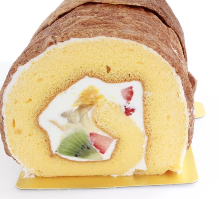 しっとり柔らかなスフレ生地と生クリームで、4種のフルーツを優しく巻き上げました。中心にカスタードクリームが入っているのでボリューム満点!