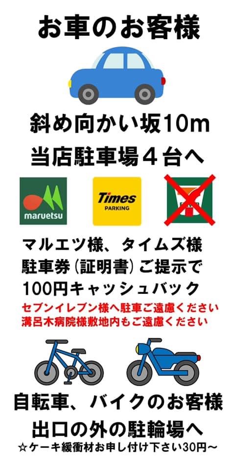 お車、バイク、自転車のお客様は、当店駐車場、駐輪場にお願い致します。