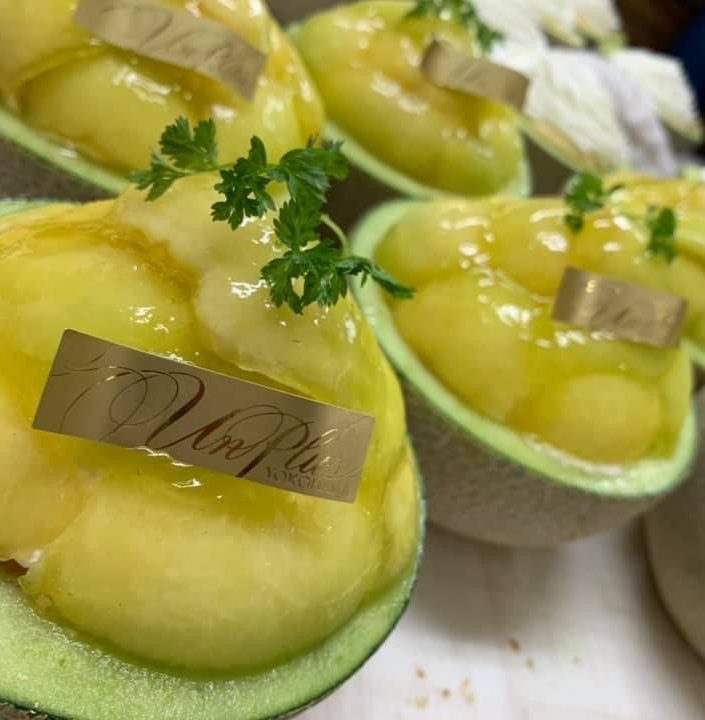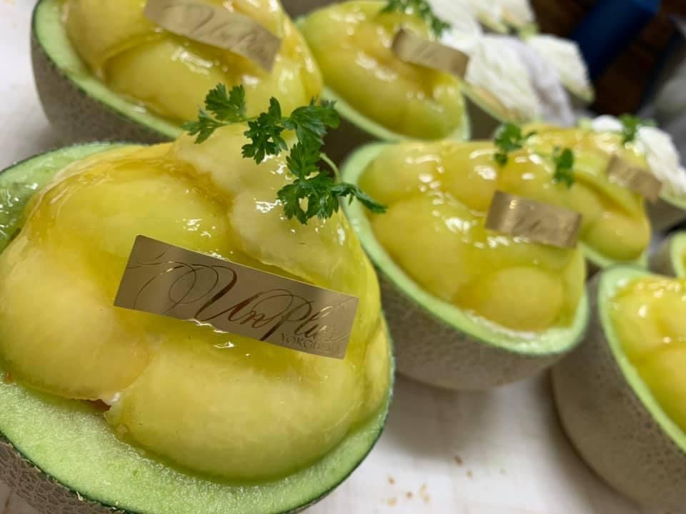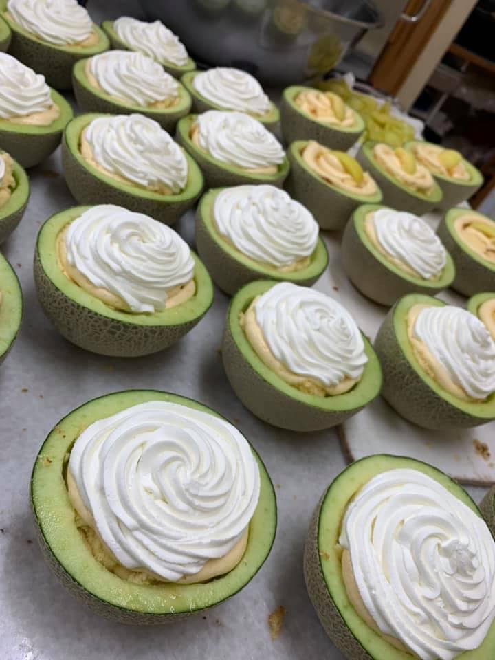 完熟メロンの中をくり抜き中と外側に飾りつけました。