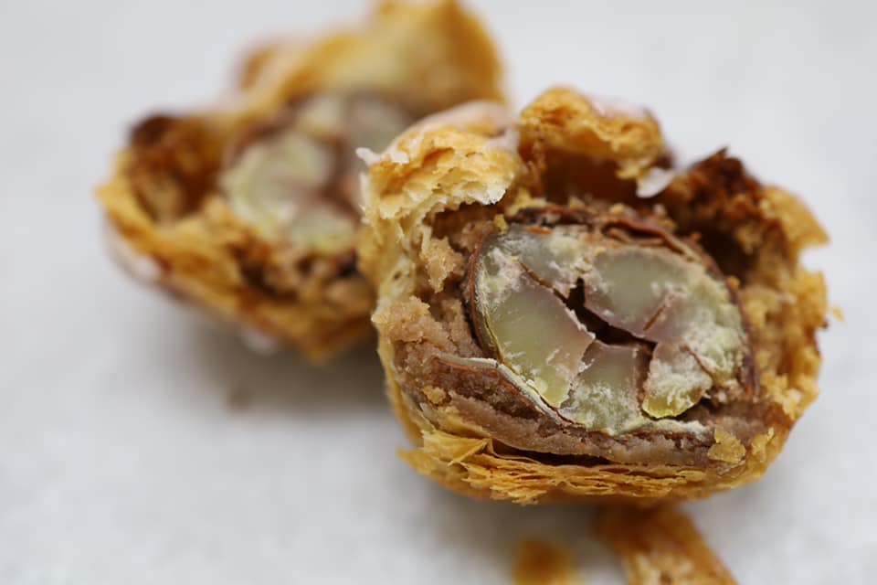 通常マロンパイの栗はメーカーさんが調理した栗なのに対して、究極のマロンパイの栗は当店で調理した自家製です。生の栗を仕入れ鬼皮を剥き茹でこぼしでアク抜きを行い、日数をかけてシロップの糖度を徐々に上げて作った大変手間の掛かった商品です。その為たくさん作れないのですぐに売り切れてしまいます。