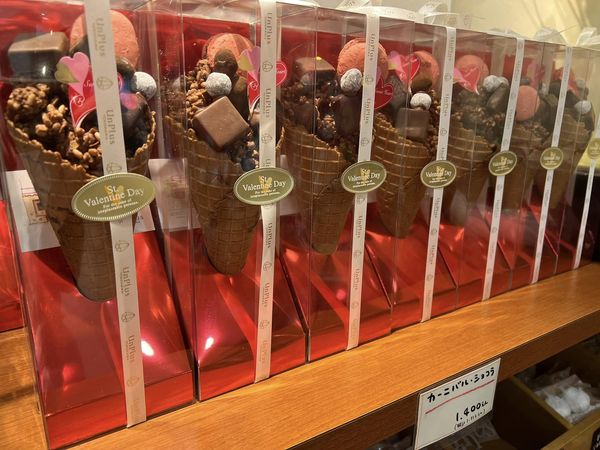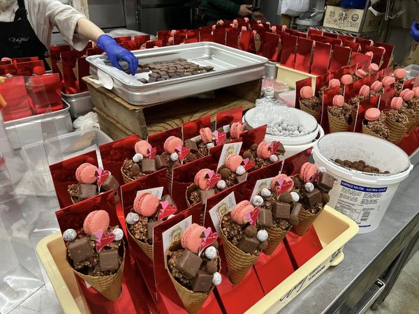 チョコ掛けシュガーコーンの中には、クッキーとチョコ掛けクランチを詰めて、マカロン、チョコレート、アーモンドショコラ、ヘーゼルショコラを接着して飾り壊さないようにそーっとケースに入れてリボン掛けて販売します。