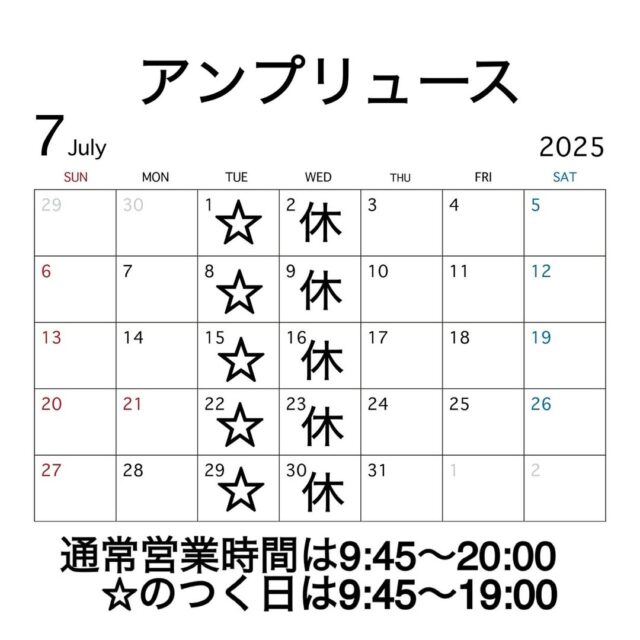 7月の営業日のご案内です。 2025.06.24 NEWS Tweet こんにちは♪アンプリュースです 7月の営業日のご案内です。 来月もたくさんのお客様のご来店 心よりお待ちしております Facebook で共有するにはクリックしてください (新しいウィンドウで開きます) Facebook クリックして X で共有 (新しいウィンドウで開きます) X Tweet