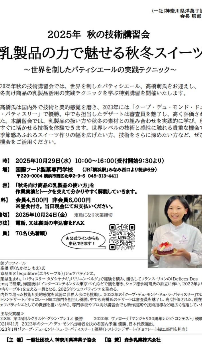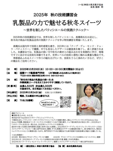 神奈川県洋菓子協会では10/29(水)に講習会を行います。 2025.10.20 NEWS Tweet 神奈川県洋菓子協会では10/29(水)に講習会を行います。 今回の技術講習会では、世界を制したパティシエール、高橋萌氏をお迎えし、秋冬向け商品の乳製品活用の実践テクニックを学ぶ特別講習を開催いたします。 まだ若干の空きがございますので他県の方もどうぞご参加ください! 詳しくは神奈川県洋菓子協会まで直接お問い合わせください。 045-453-0332 宜しくお願い致します。 Facebook で共有するにはクリックしてください (新しいウィンドウで開きます) Facebook クリックして X で共有 (新しいウィンドウで開きます) X Tweet