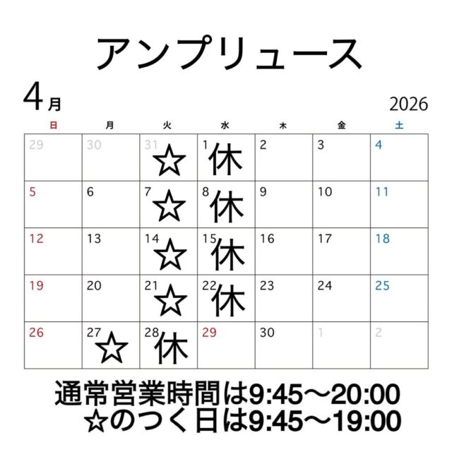 4月の営業日のご案内です。 2026.03.27 NEWS Tweet こんにちは♪アンプリュースです 4月の営業日のご案内です。 4月ということで新生活が始まる人も いらっしゃるのではないでしょうか。 進学・就職などのお祝いにぜひ アンプリュースのケーキや焼き菓子を ご利用くださいませ。 たくさんのお客様のご来店 心よりお待ちしております。 Facebook で共有 (新しいウィンドウで開きます) Facebook X で共有 (新しいウィンドウで開きます) X Tweet